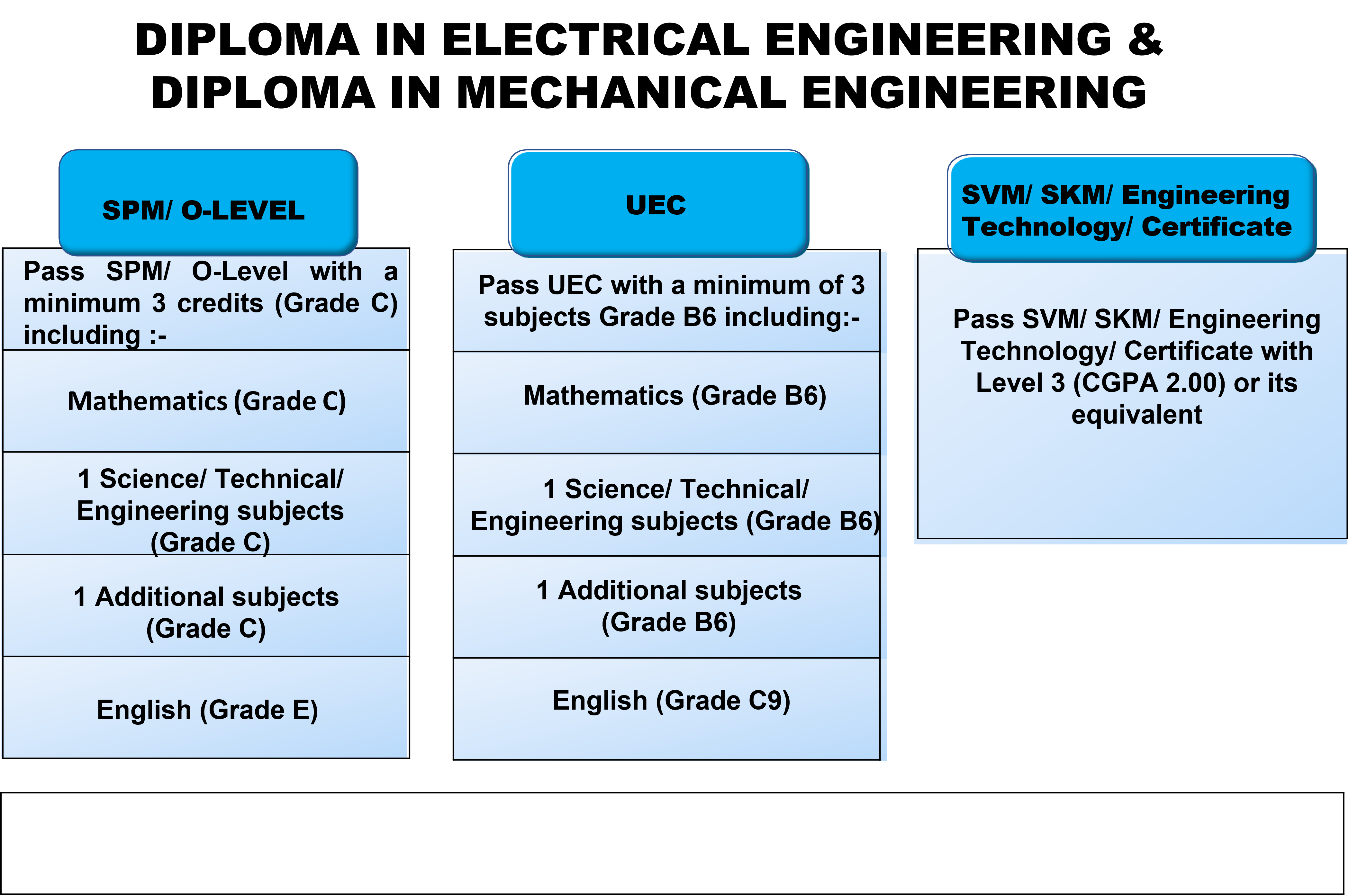 The Diploma in Electrical Engineering programme is designed to prepare you for professional career and to further your study to bachelor degree in the related engineering field. We adopt comprehensive and innovative content and teaching techniques, which are designed towards expanding the frontiers of learning and inculcating a probing mind.