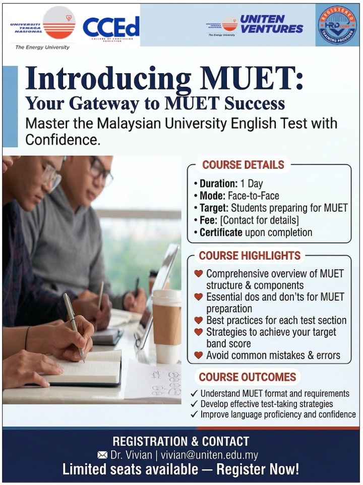 This course offers a comprehensive introduction to the Malaysian University English Test (MUET), designed to guide students through its structure, requirements, and assessment methods. It covers the essential dos and don’ts of MUET preparation, highlighting best practices for tackling each component of the test. Through practical examples and expert tips, students will gain a solid understanding of the examination’s expectations, common pitfalls, and effective strategies for achieving their desired band score. |