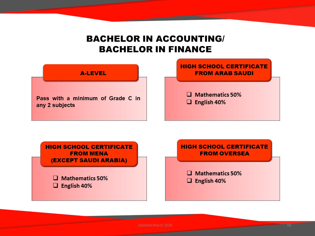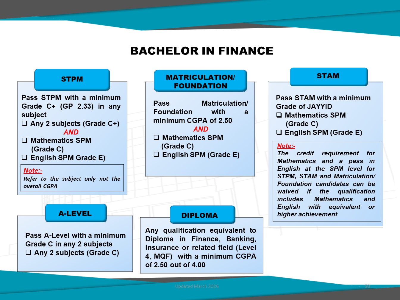 Bachelor in Finance (Honours) offered by UNITEN Business School, is designed to equip students with in-depth knowledge of financial theories, tools, and technologies required in today's dynamic financial sector. This programme blends core finance principles with practical applications in areas such as investment analysis, financial markets, financial modelling, and FinTech innovation.
