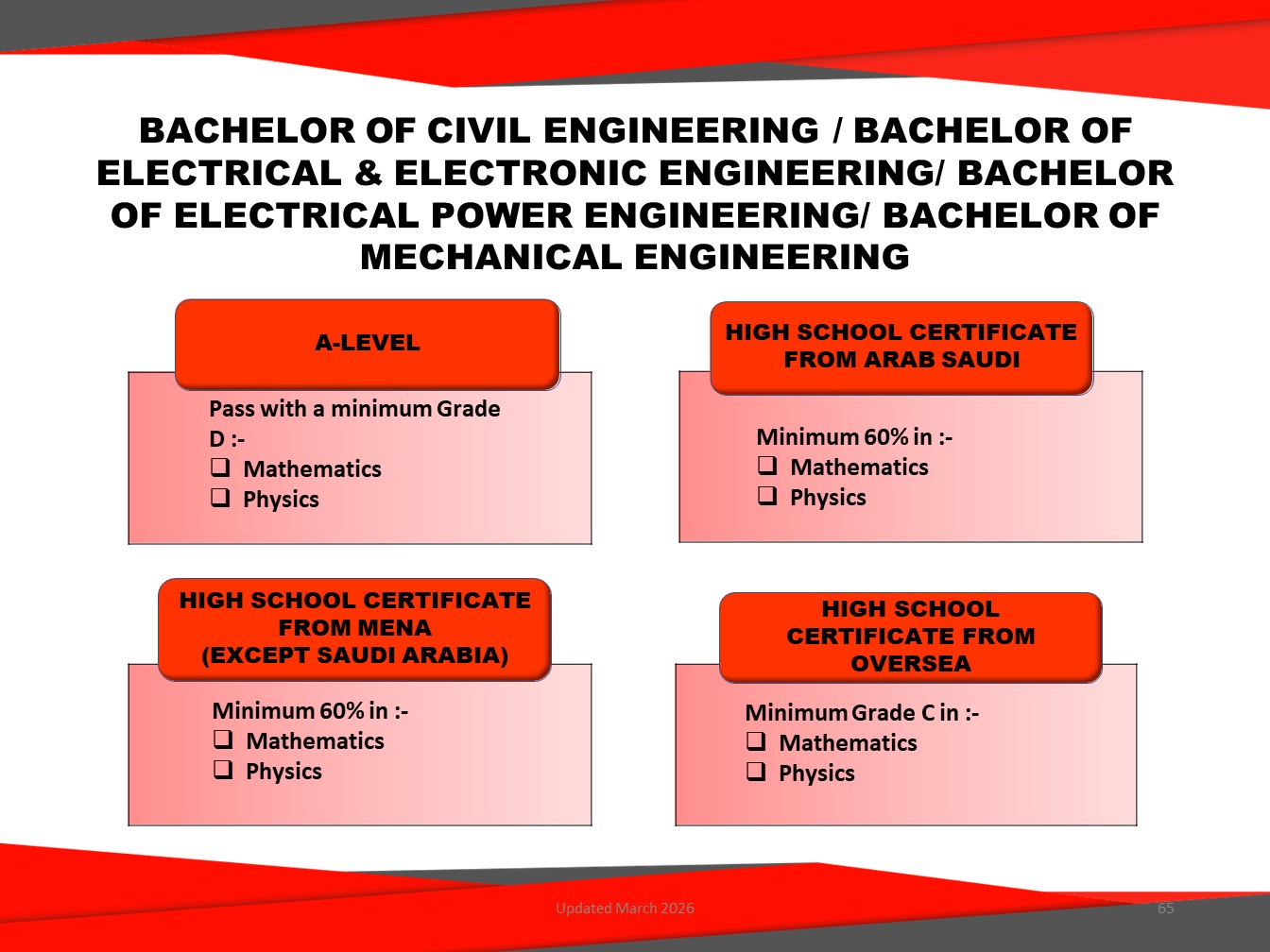 The Bachelor of Civil Engineering (Hons) is a four-year programme covering key areas such as structural engineering, geotechnical engineering, transportation and highway engineering, water engineering, environmental engineering, project management, and construction.