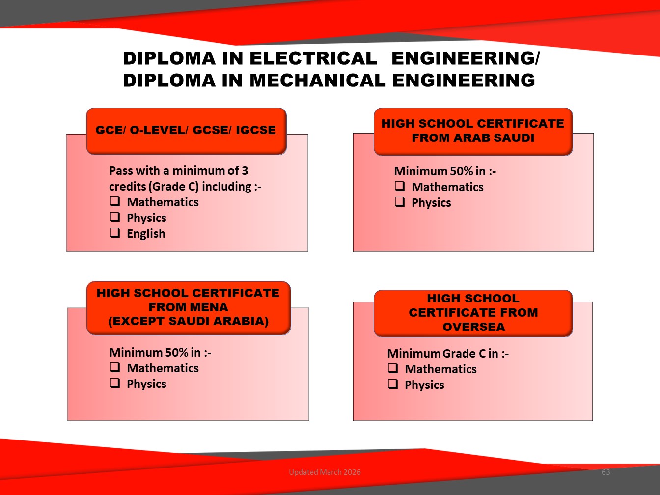 The Diploma in Electrical Engineering programme is designed to prepare you for professional career and to further your study to bachelor degree in the related engineering field. We adopt comprehensive and innovative content and teaching techniques, which are designed towards expanding the frontiers of learning and inculcating a probing mind.