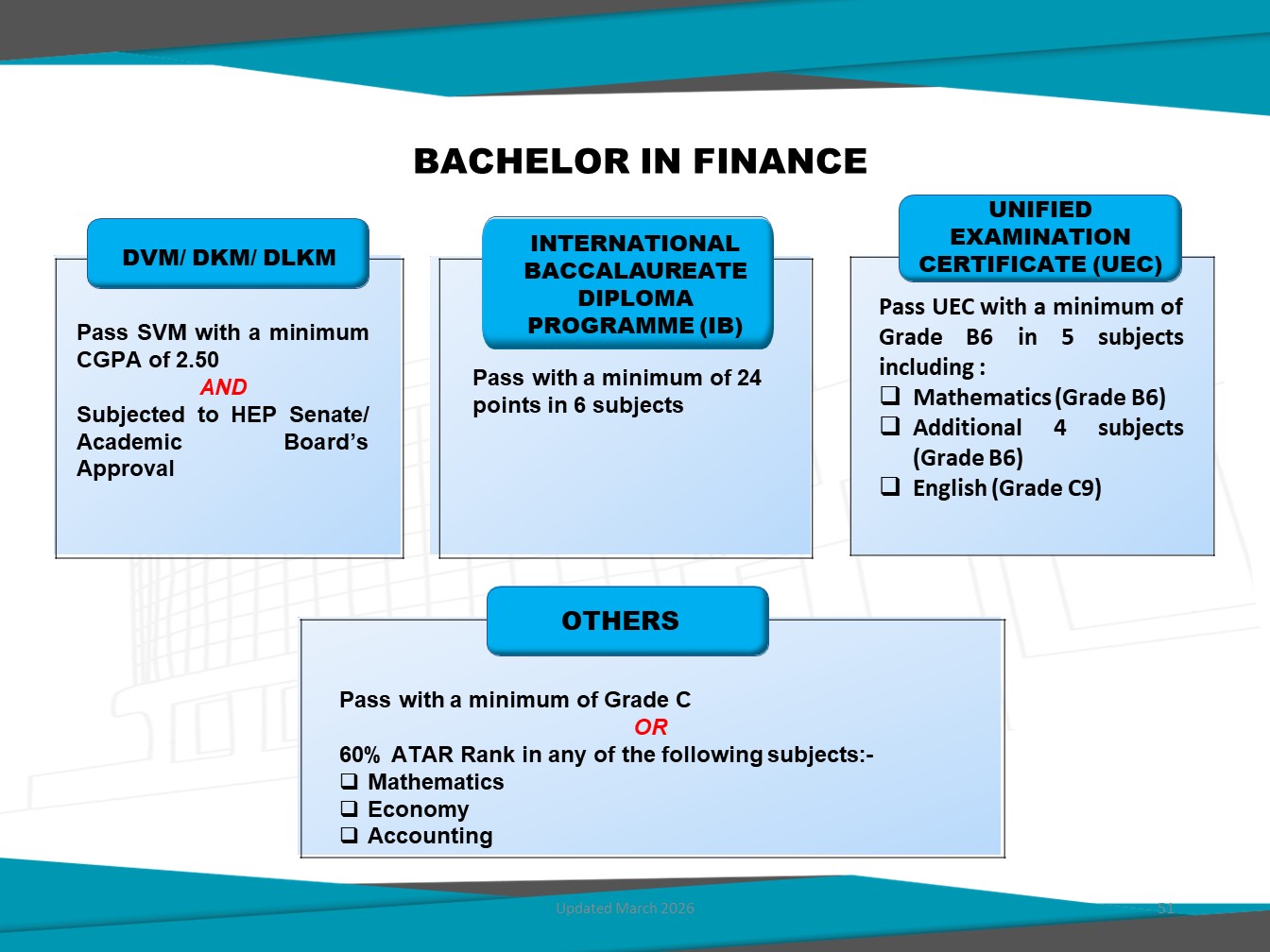 Bachelor in Finance (Honours) offered by UNITEN Business School, is designed to equip students with in-depth knowledge of financial theories, tools, and technologies required in today's dynamic financial sector. This programme blends core finance principles with practical applications in areas such as investment analysis, financial markets, financial modelling, and FinTech innovation.