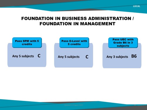 Foundation in Management is specifically designed to prepare a student with basic knowledge related to economics and management. This programme gives students a good understanding and strong preparation for them before furthering their studies to a higher level in economics and management or other fields of their interest.